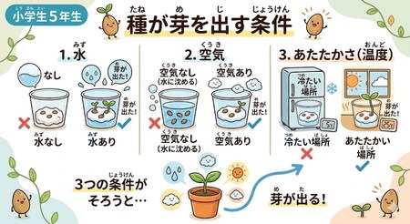 『小学生5年生に種子が発芽する条件(水・空気・温度)を教える時の図を作って』