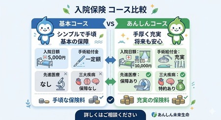 『入院保険の基本コースとあんしんコースの違いを端的に語って、比較する図解を日本語で、文字数は少なく視認性が良いように作って。保険なので、誠実な雰囲気、安心感のある色合いで。』