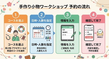 当店の手作り小物ワークショップへのご参加をご検討いただき、誠にありがとうございます。予約は以下の4つのステップで簡単に完了します。